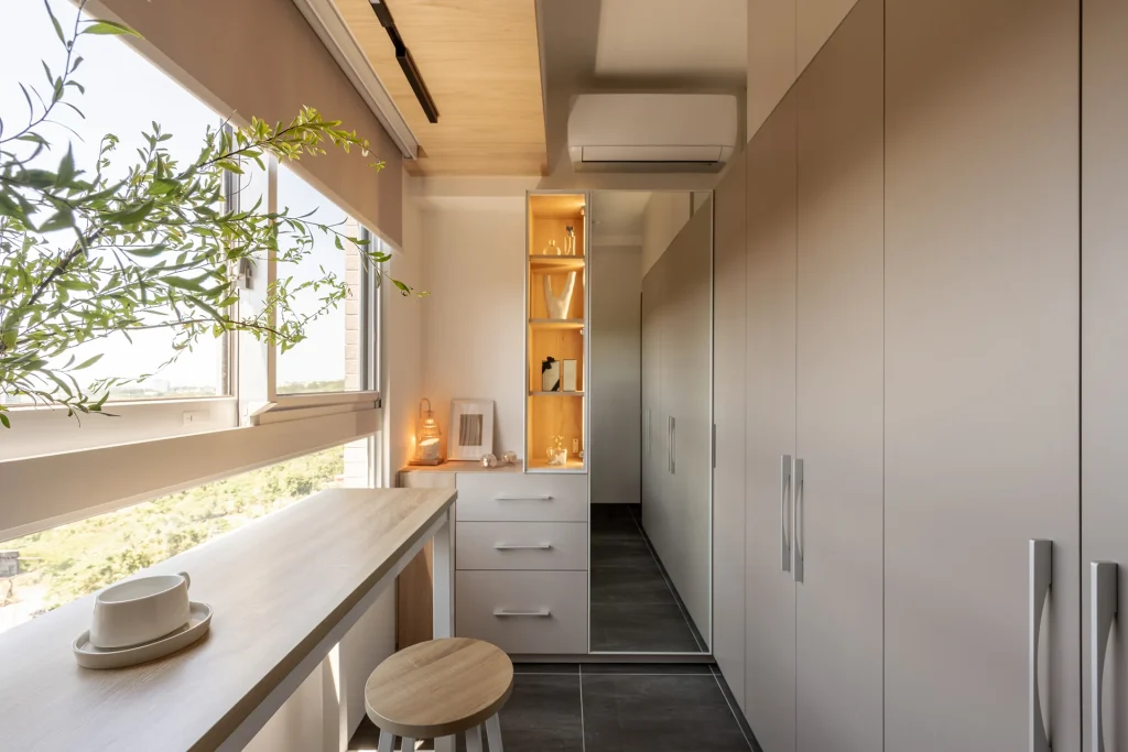但當它被定位為臥室時,這些全部就變成缺點了;而當它成為更衣室時,再結合小型儲藏室的功能,加上高吧桌與貓跳台,這些元素全都成了優點。這樣不但大間房的空間利用率超高,其他空間也因為收納集中在這裏,而變得更開闊、更好用,那根大樑反而幫我們成為燈光最佳的位置,距離高吧桌剛剛好的尺寸與高度。