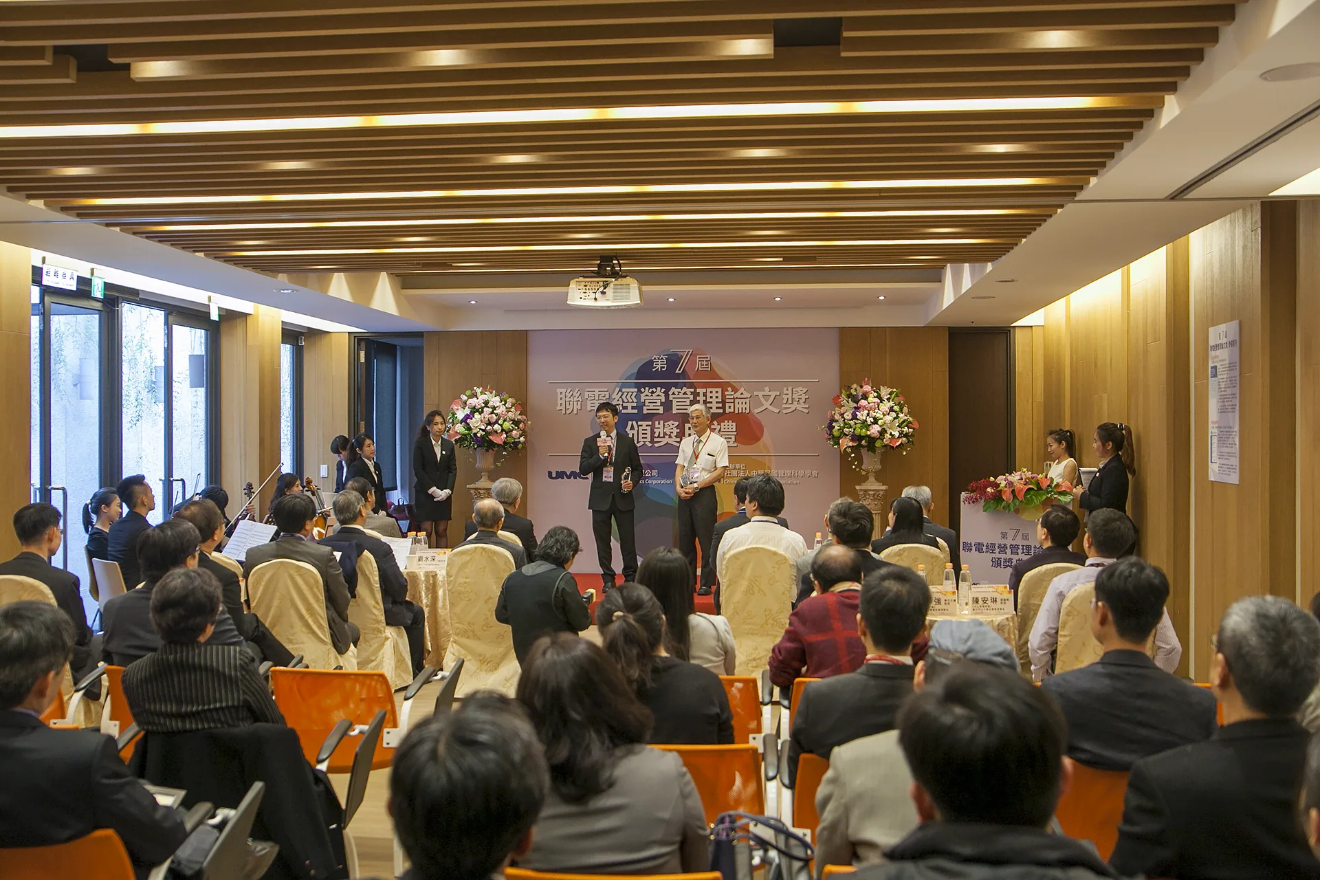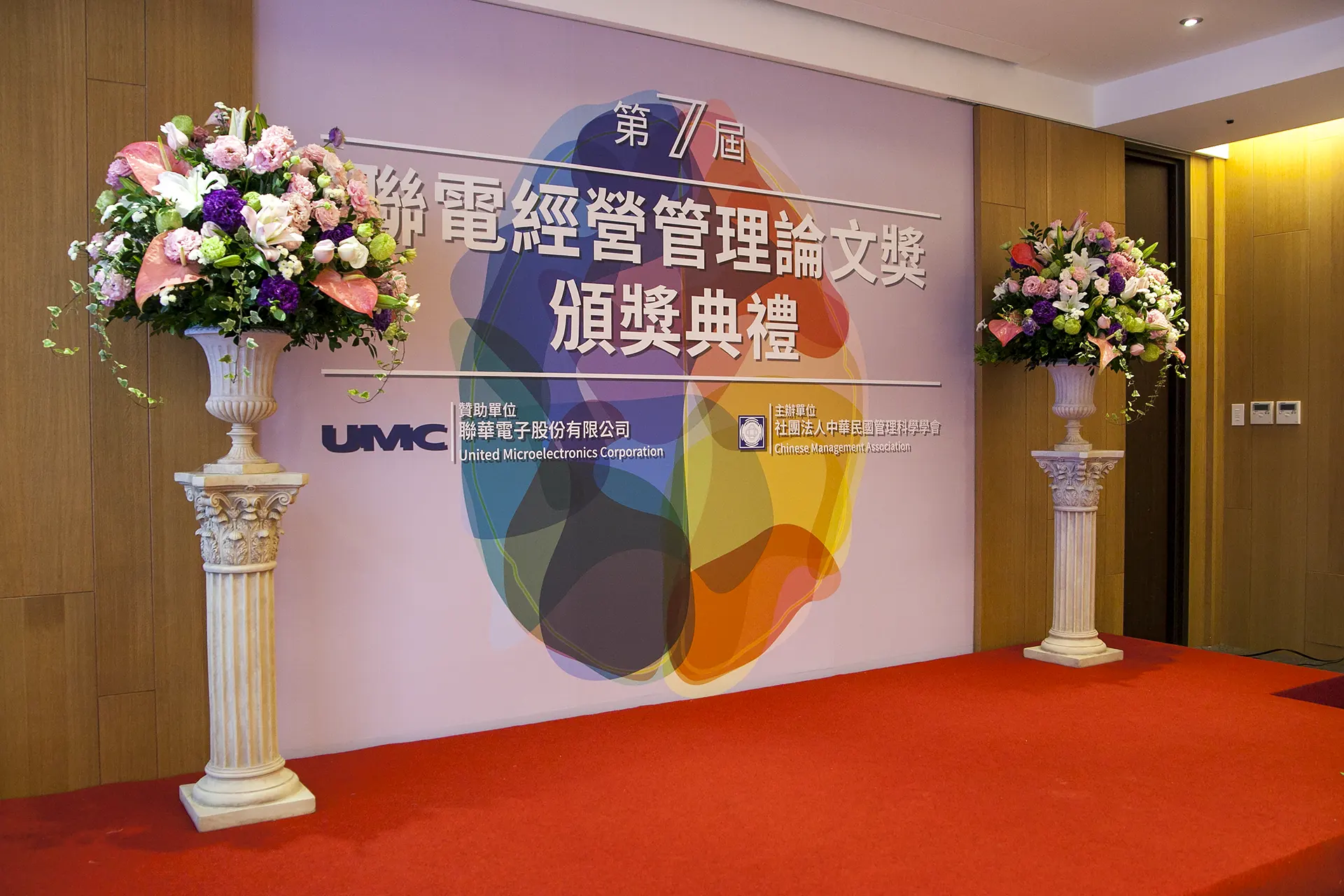 第七屆聯電經營管理論文獎,選定在充滿歷史底蘊的孫運璿紀念館舉行,順應場館既有的溫潤木質格調與濃厚人文氣息,我們捨棄了制式的背板搭建,轉而以花藝作為舞台的視覺主角。