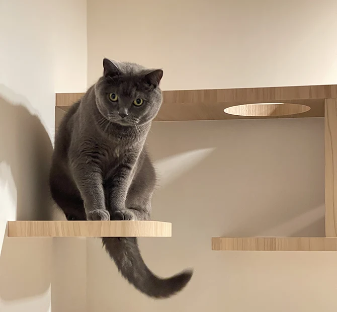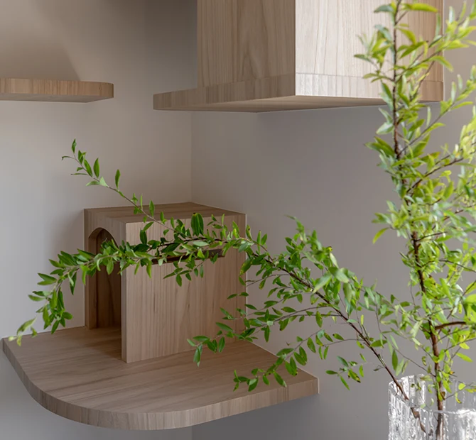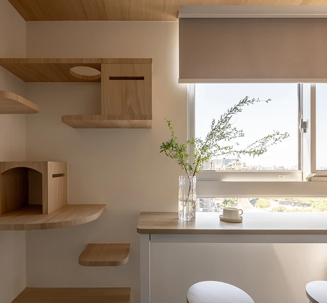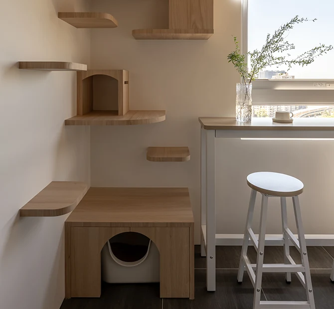 我們將毛孩需求視為的主角,把貓跳台與貓砂櫃,從必需品,昇華為賞心悅目的端景,並將貓咪的動線,與主人的休憩角落無縫整合。對貓咪天性的尊重,也藏在每個細節裏,多樣化路徑,是為了能自由選擇,避免壓力;貓對氣味的講究遠超人類,為貓砂盆區規劃通氣孔,更是對牠們愛乾淨的天性,一份最深的體貼。最終我們完成以最簡潔的元素,創造出一個讓所有成員,都能各得其所、和諧共存的家。