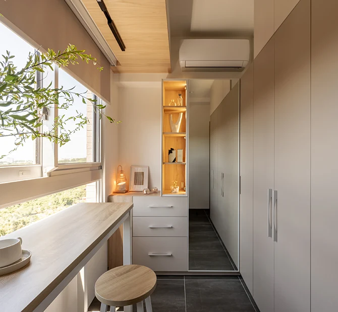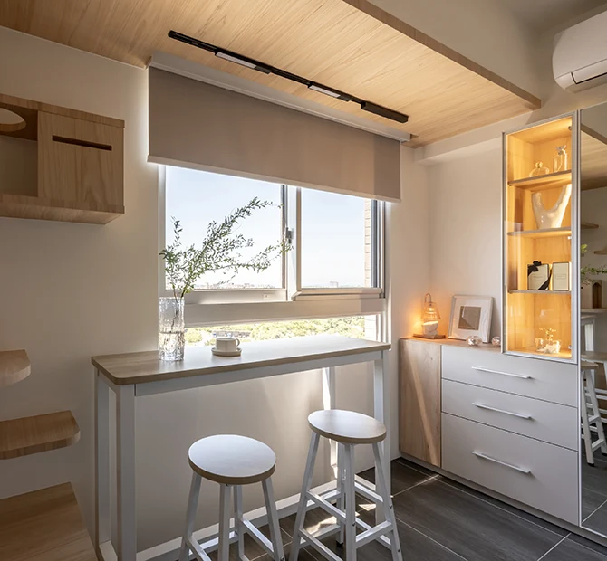 我們為這個空間,設想了三種幸福的可能,首先是能整齊收納大量衣物的幸福,俐落的系統櫃與大面穿衣鏡,滿足所有收納與打理儀容的需求。接著,是能陪伴心愛寵物的幸福。 我們串連高吧桌與貓跳台,為毛孩打造了一座能安心跳躍、靜觀窗景的垂直樂園。最後,是能讓自己放鬆的幸福。 也巧妙讓那道礙眼的樑,提供最佳的燈光位置,讓高吧桌擁有溫暖光源,創造出一個適合閱讀、賞景的完美角落。