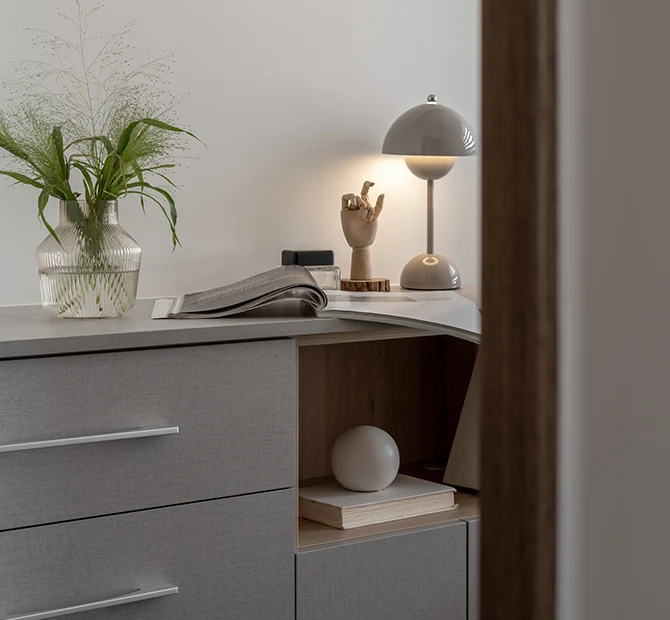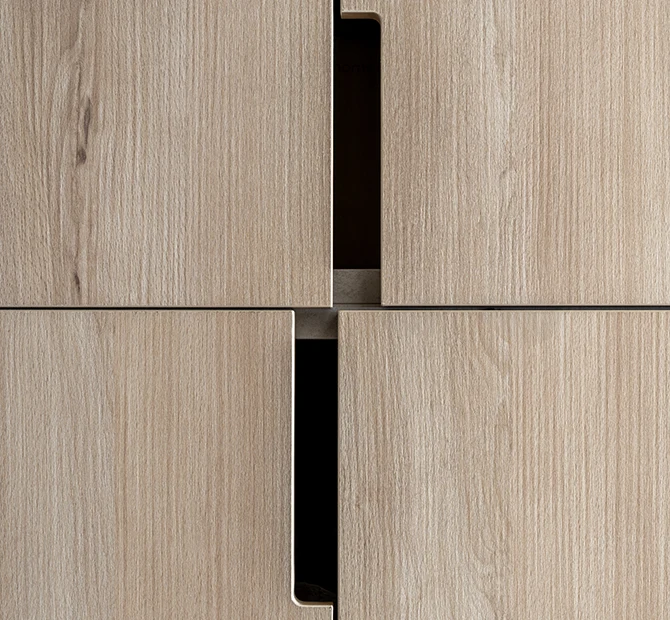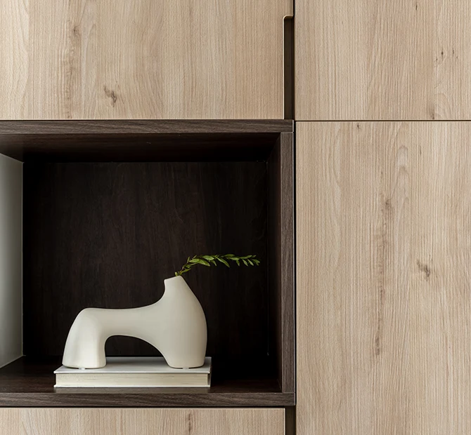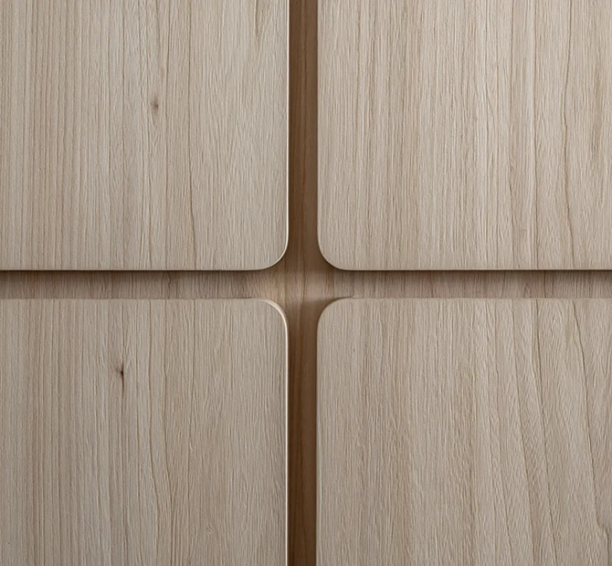 一座頂天立地的收納高櫃,如格在要滿足機能的同時,不顯得笨重壓迫?我們的答案,藏在日式美學的精髓裏,不在於增加了什麼,而是如何用最少的元素,創造最深的韻味。沒有使用複雜的造型或把手,而是奉行輕量裝修的減法藝術,只在每一扇門片的轉角,向內切削出一道圓弧,當四扇門片闔上時,一個宛如幸運草般的雅緻圖騰,便自然浮現。它是低調的驚喜,一個獻給家的幸運祝福,也是在機能與美感之間,找到那個恰到好處的解答。