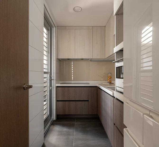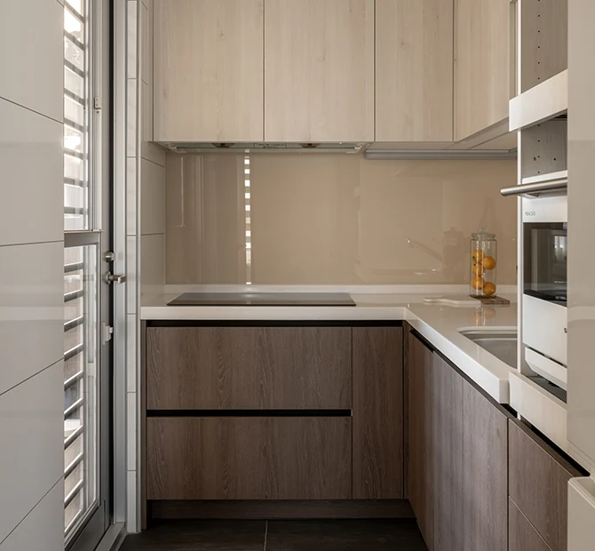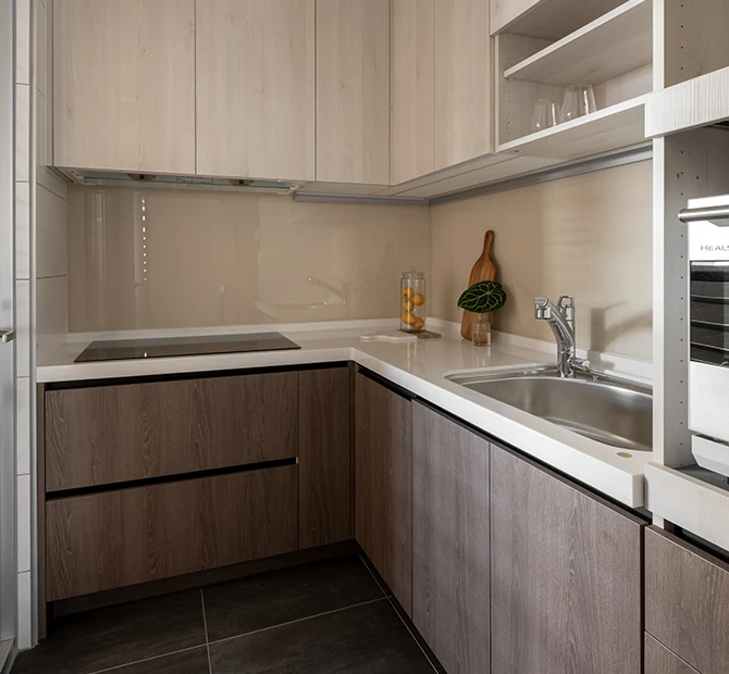 建商的一字型的210公分廚具,是坪效的妥協,卻犧牲了使用的流暢性。我們捨棄了建商的配置,透過精準設計,將廚房重塑成 L 型,榨出坪效的最大利用率,不僅能換大水槽,也擴增了一倍的備料檯面,更創造出完美的烹飪動線,連洗碗機與電器櫃都有了專屬的位置。讓洗滌、備料到烹煮,每一步都變得從容不迫。正是輕量裝修的價值,不必大興土木拆牆,只需聰明的改變,就能為你創造一個能真正享受烹飪樂趣。