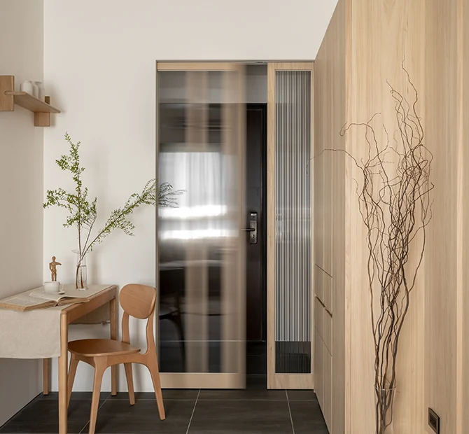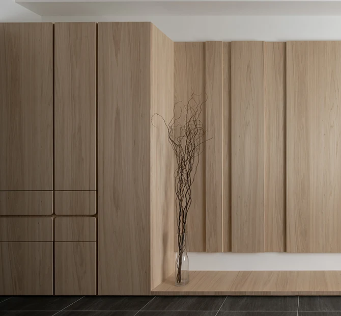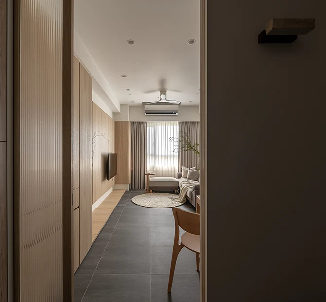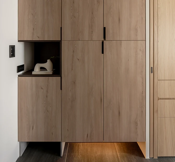 玄關是家的門面,也最容易顯得雜亂。我們的設計哲學是恰到好處,收納要足夠,但絕不壓迫。透過對屋主的理解,規劃出恰到好處的收納量,滿足收納也巧妙界定出場域。視覺上,我們延續日式無印的純粹,將所有機能化為一道安靜的風景。俐落的無把手設計,簡約之外更是讓視覺毫無干擾。也暗藏著透氣的貼心,創造出最有秩序、也最溫潤的回家體驗。