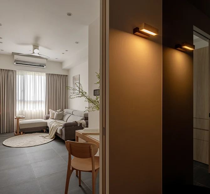 對於嚮往寧靜的屋主來說,家需要一個溫柔的過渡,一個能隔絕外界塵囂的緩衝區。透過二進式玄關,阻隔外界的喧囂,並使用大面積的灰鏡作為主牆,巧妙放大了空間感與整理儀容的需求,這個設計,滿足了屋主對安靜與隱私的重視,也更為每一次的回家,在溫暖的燈光下,映照出沉靜的光影,成為迎接疲憊歸家的溫暖信號。