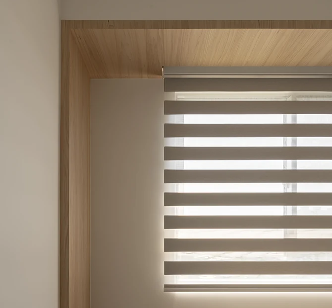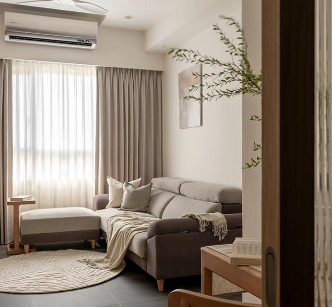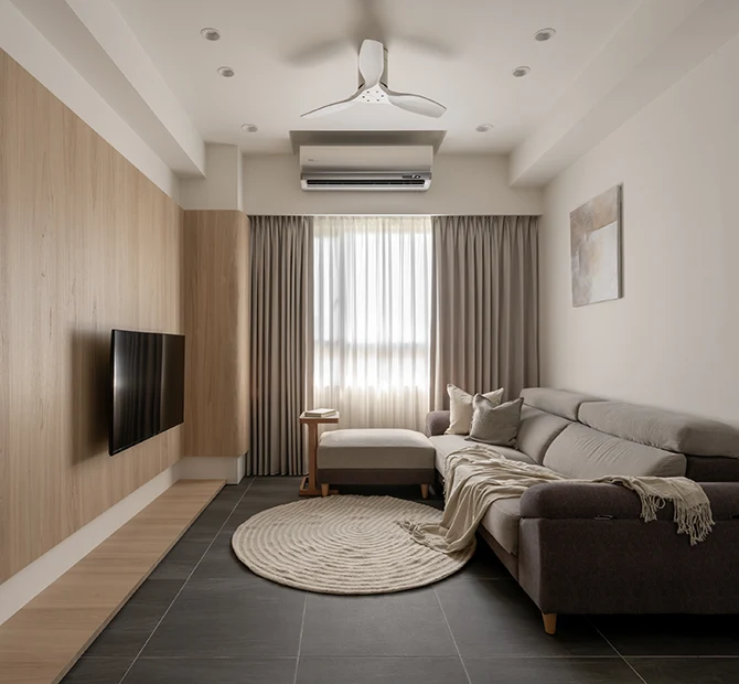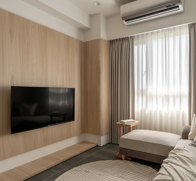 屋主非常喜歡誠品的那種木質調,也喜歡簡約的設計,如何讓簡約不落入平凡呢?溫潤的木質電視牆,作為整個空間唯一,也最溫柔的表情。牆面上律動的垂直線條,是我們在極簡之中,為視覺增添的細膩層次;而輕柔的紗簾,將窗外的陽光,篩成一天中最柔和的光影。這就是精準設計與輕量裝修的完美結合,沒有多餘,只將舞台,留給最重要的光線、材質,與家人們的生活。