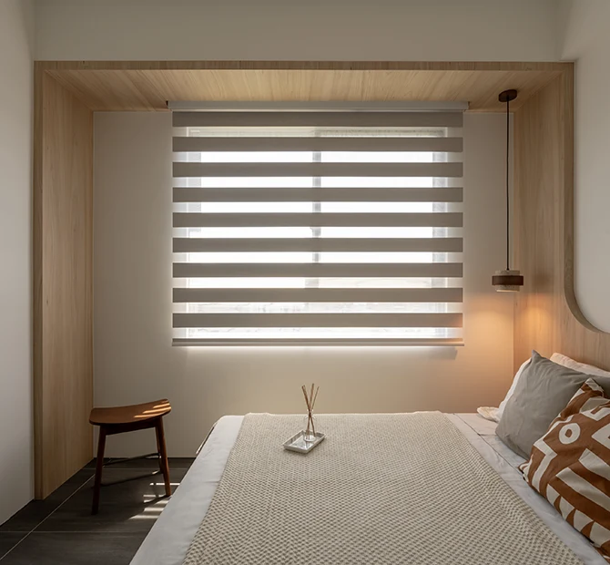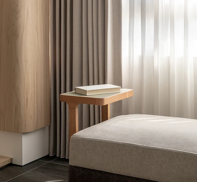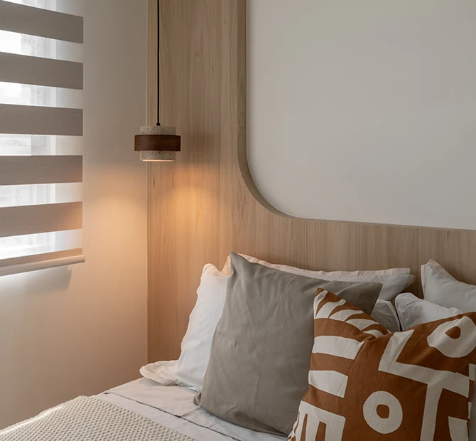 面對主臥大樑,時下流行用大面積的圓弧包覆天花板,雖然流暢,卻也犧牲了寶貴的屋高與預算。我們不選擇隱藏,而是轉化,用一道與床頭整合的木作框架,將壓迫感轉化為安穩的包覆感,並為空間創造出更具整體性的視覺延伸,也讓燈光找到了最佳位置。這份看似輕巧的設計,背後是我們為屋主省下時間與預算的精準堅持。