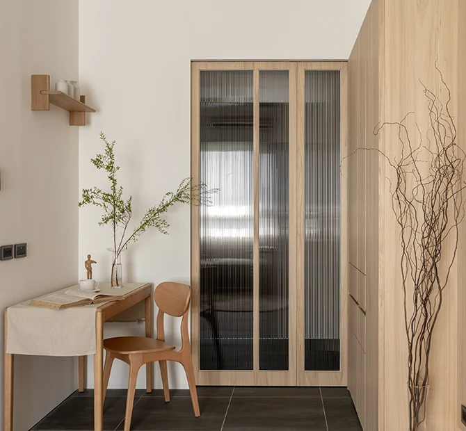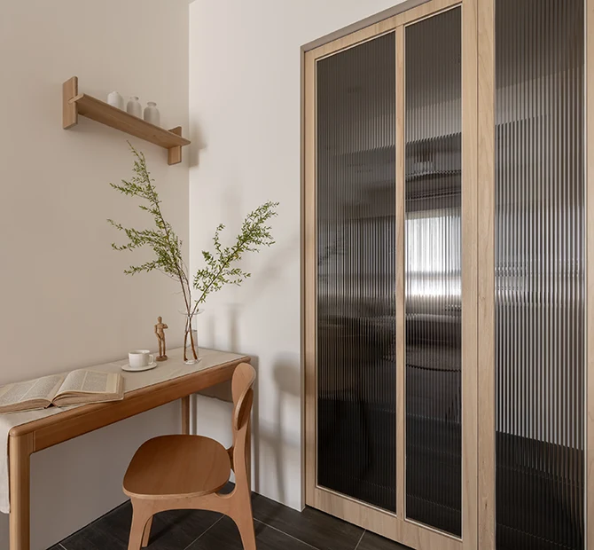 餐廳,承載多重的生活想像,是專注工作的角落,也是夜晚與家人分享生活的溫暖地方。溫潤的木質調,為思緒帶來安定,我們用一道長虹玻璃拉門,隔絕了外界聲音,卻不阻斷光線的流動。既能保持視覺的通透,又能提供工作時所需的專注感。牆上那道極簡的層架,是我們為這個角落留下的詩意註解,提醒著生活,永遠需要一份留白。